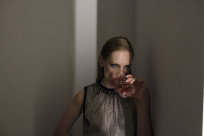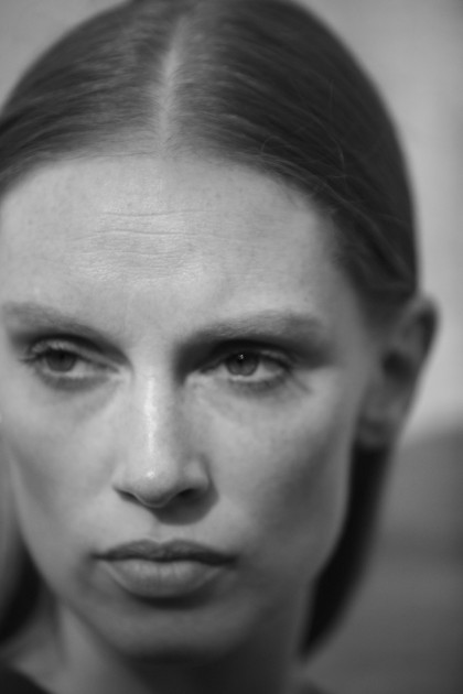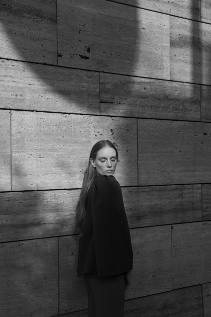 Model Bianca O'Brien wearing a turtleneck Yiorgos Eleftheriades and a coat Max Mara.