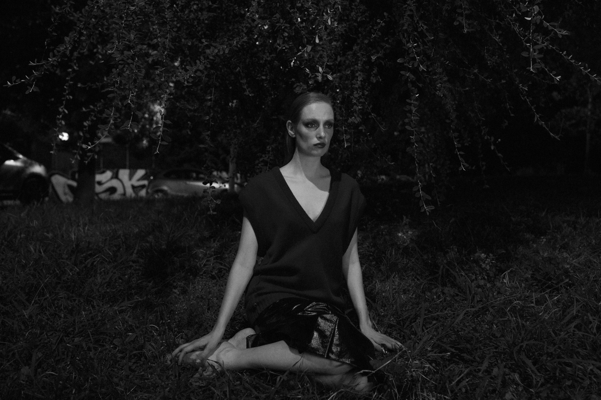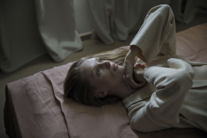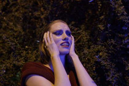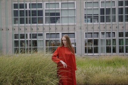 Model Bianca O'Brien wearing sweater Cos, skirt Johanna Daniil and shoes Kert Giger.