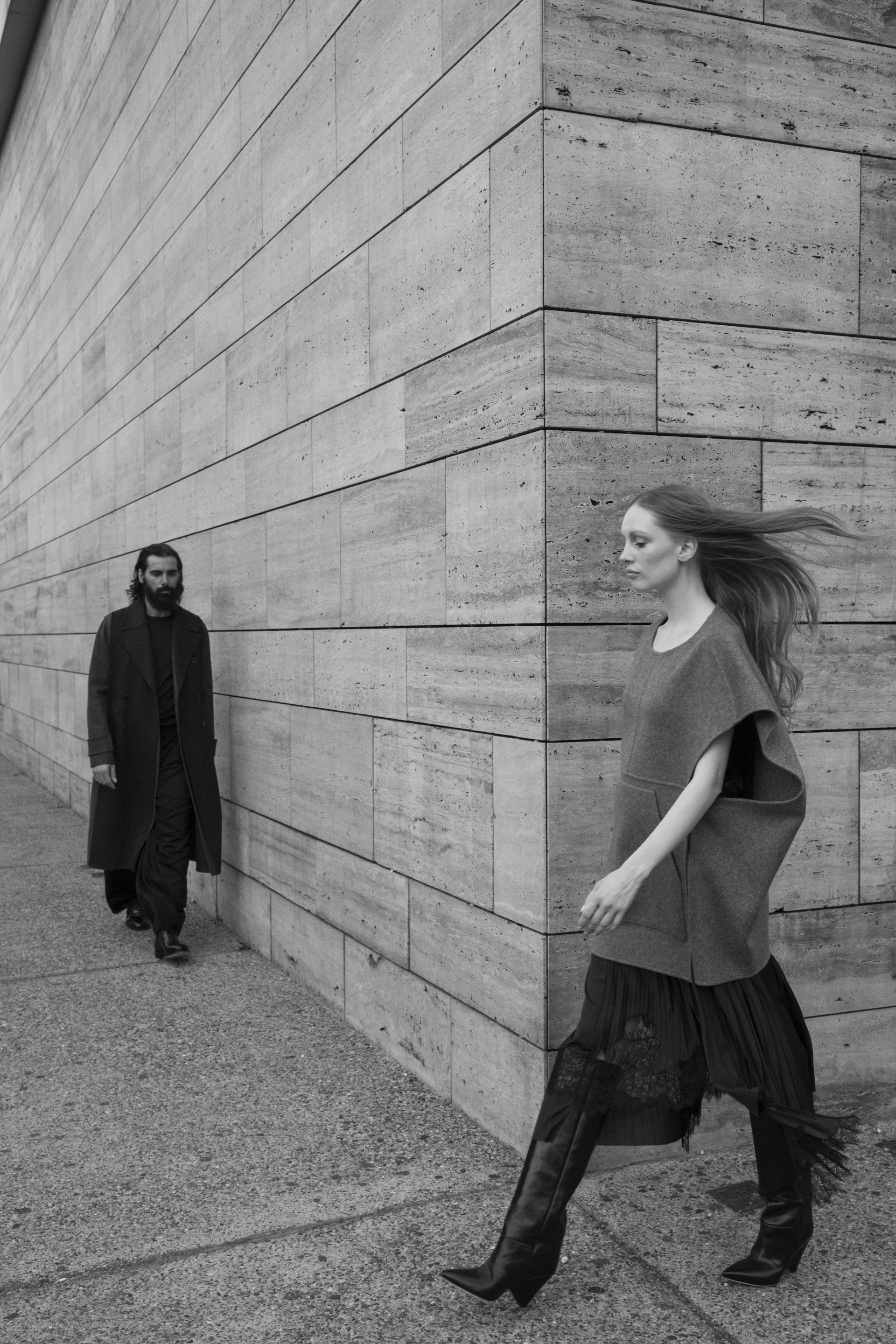 Model Bianca O'Brien wearing a sweater vest Céline and Paraskevas Babourakas wearing a Valentino coat.