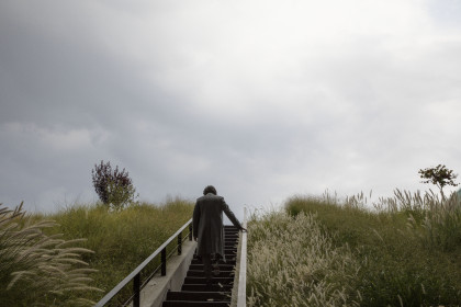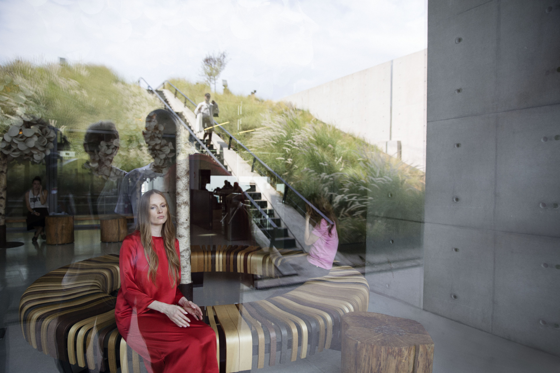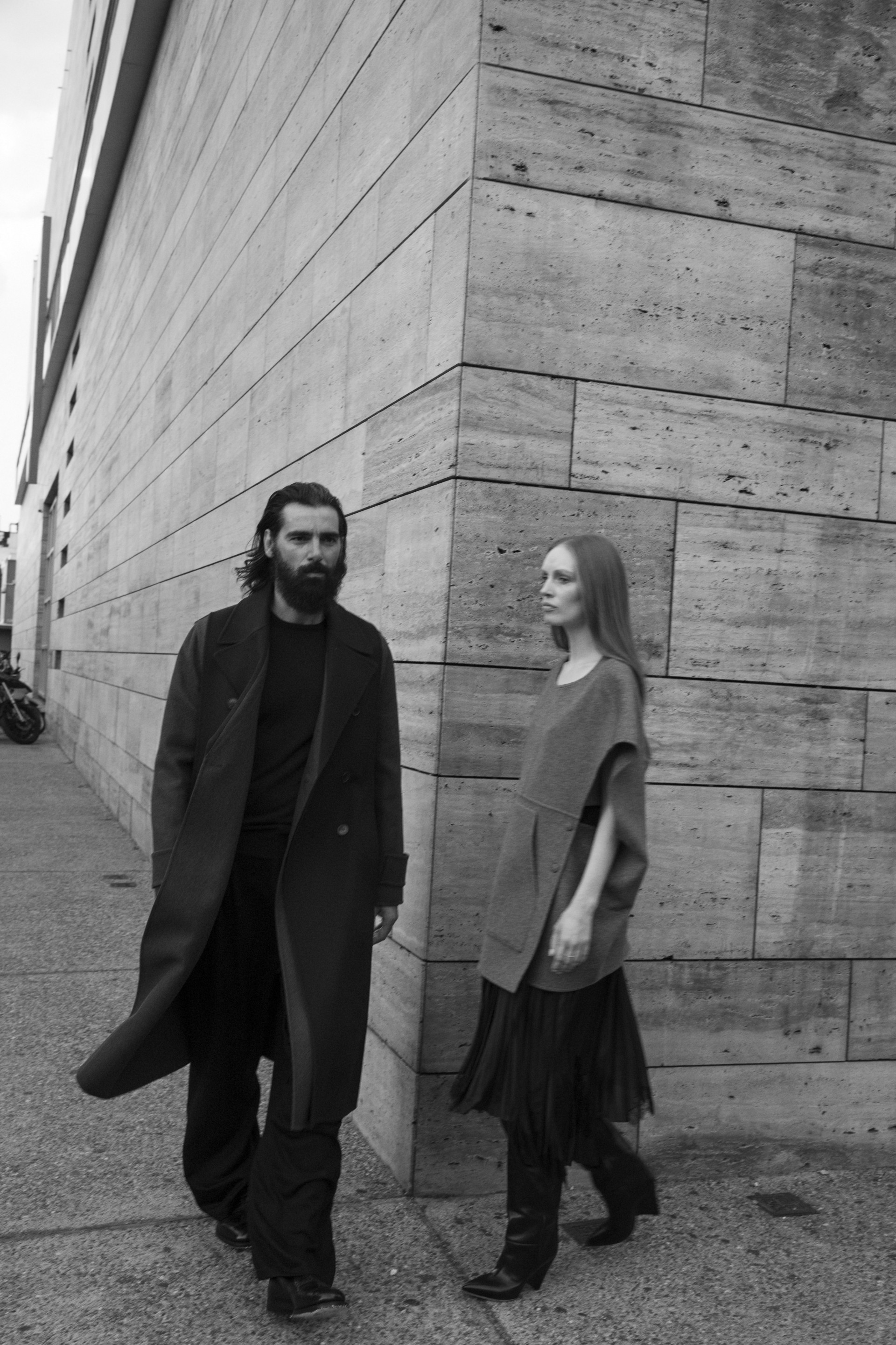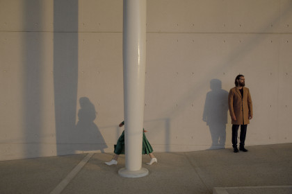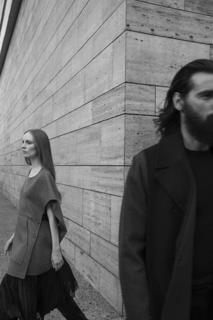 Model Bianca O'Brien wearing a shirt dress Max Mara, Kert Giger shoes and Paraskevas Babourakas wearing coat and sweater Paul Smith and a Kenzo trousers.
