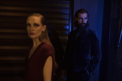 Model Bianca O'Brien wearing a suit Theory Attica and shoes Yiorgos Eleftheriades.